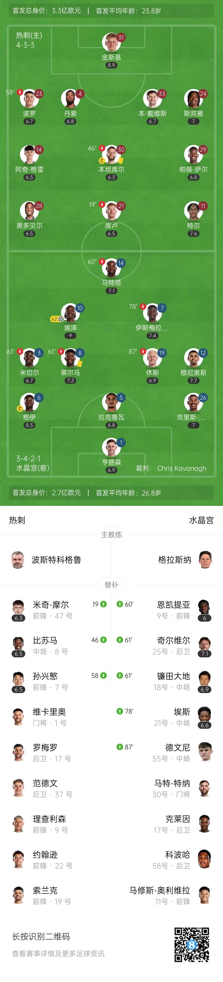 全场比赛结束,热刺0-2水晶宫。
