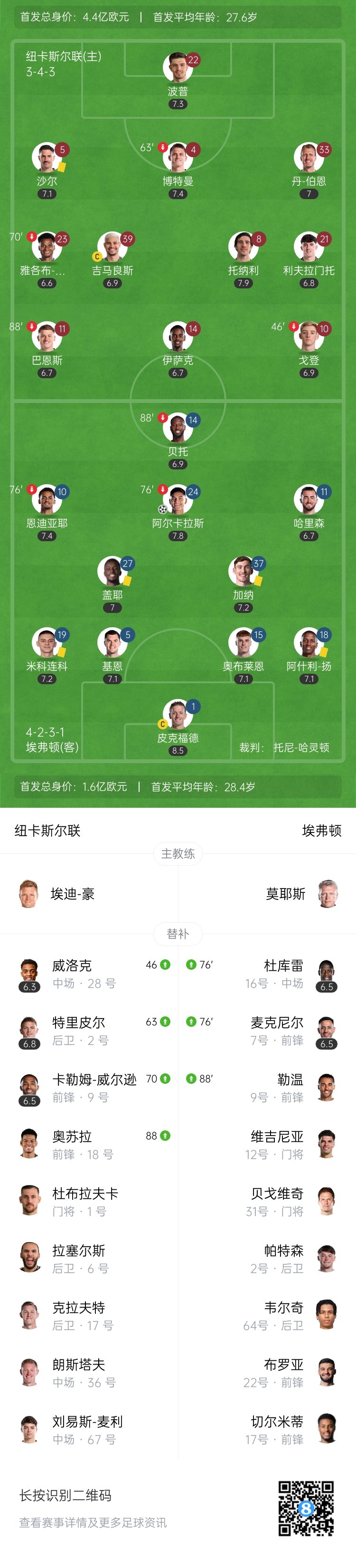 第65分钟,米科连科左路起球,禁区中阿尔卡拉斯高高跃起甩头攻门!顶进球门右下角!埃弗顿1-0领先纽卡↓
