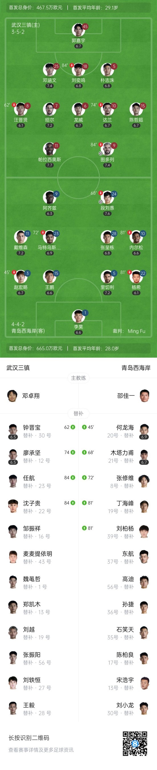 最终,武汉三镇1-1青岛西海岸。