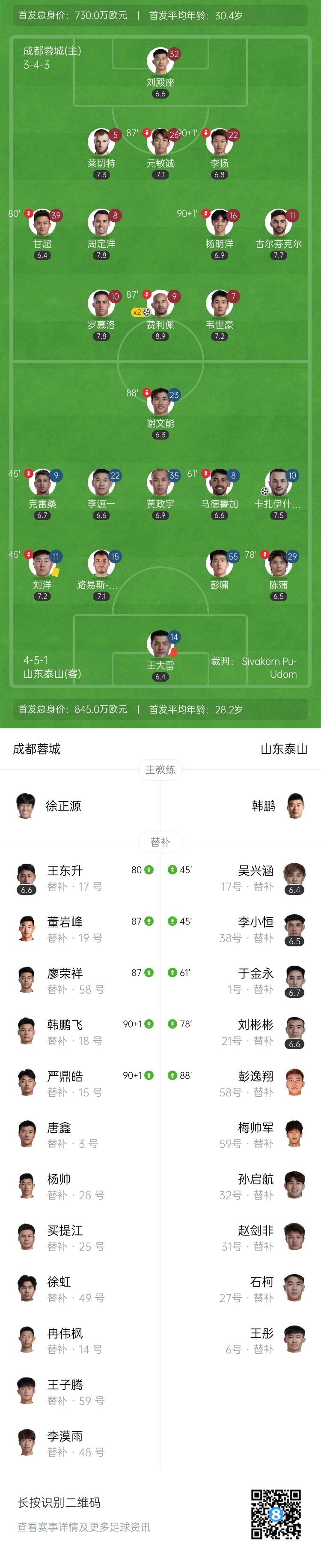 全场比赛结束,成都蓉城2-1山东泰山。