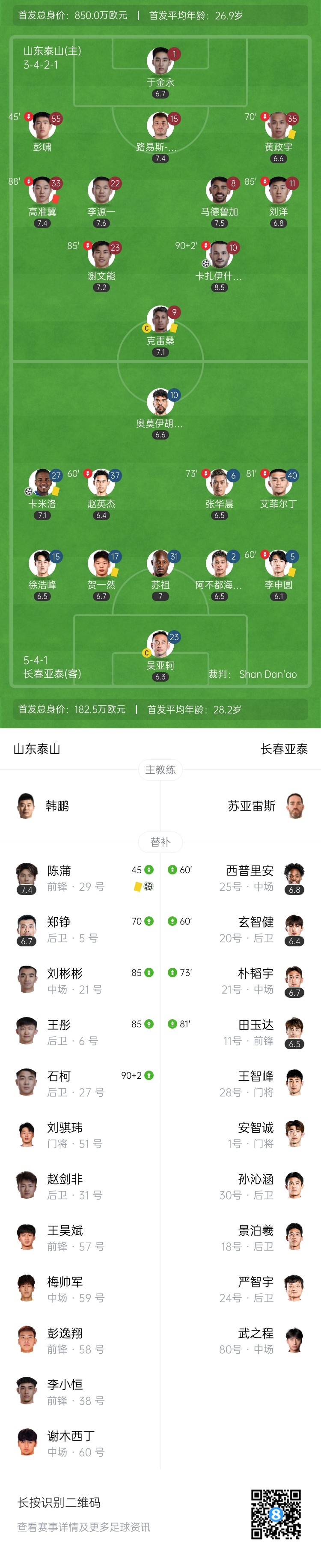 下半场伤停补时12分钟,全场比赛结束,最终山东泰山2-1长春亚泰。