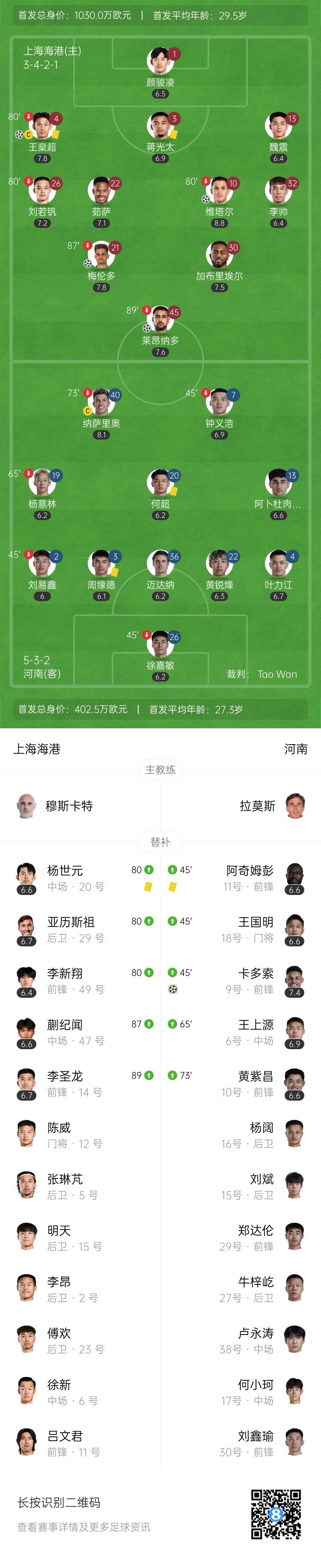 全场比赛结束,上海海港主场4-1战胜河南。