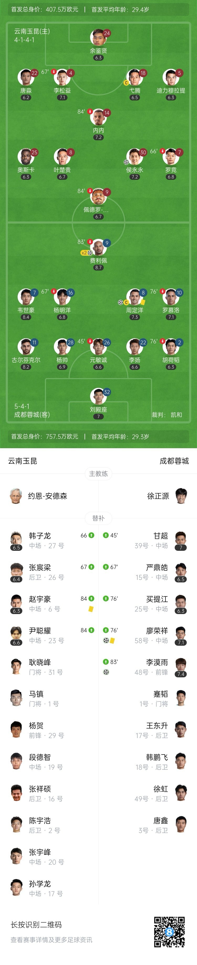 全场比赛结束,成都蓉城客场5-1大胜云南玉昆。
