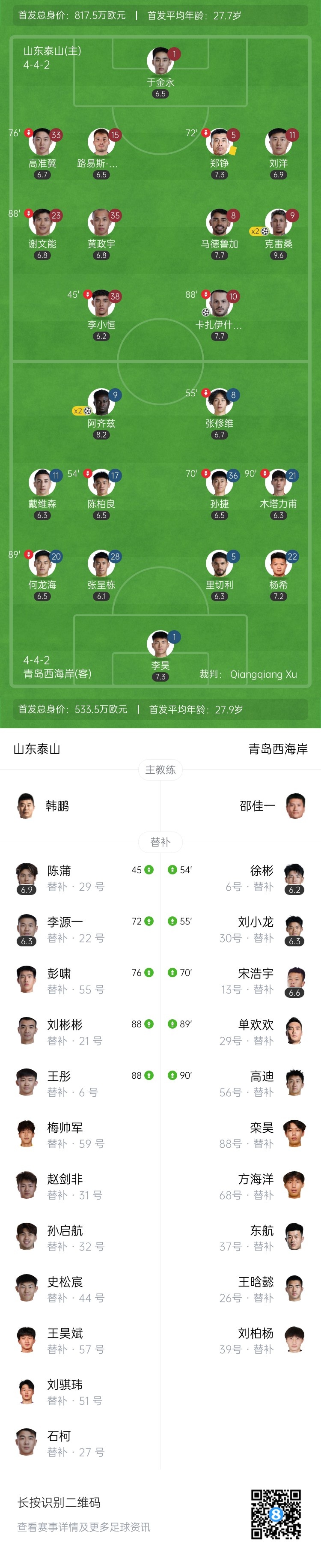 全场比赛结束,最终山东泰山3-2青岛西海岸。