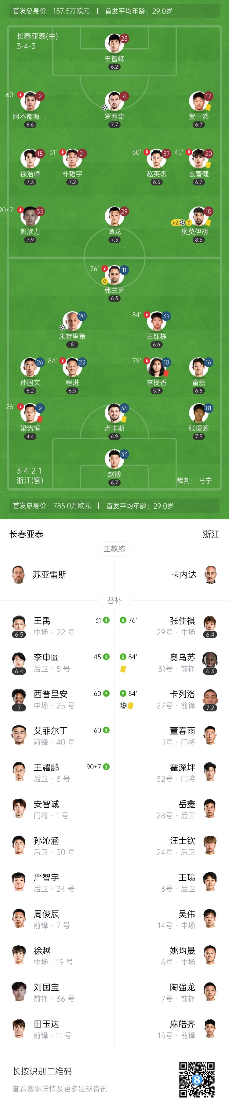 下半场补时8分钟。最终全场比赛结束,长春亚泰3-3浙江队。