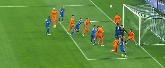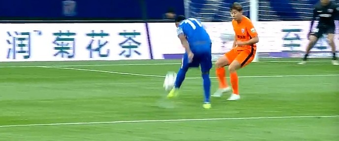 第38分钟,申花左路传球到禁区后点吴曦头球被余鉴贤神勇扑出。↓