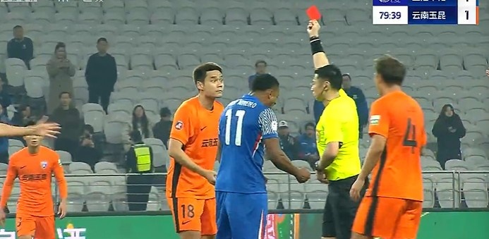 第78分钟,玉昆少打一人!弋腾阻止申花发后场定位球被裁判黄牌警告,从而两黄一红被罚下。↓