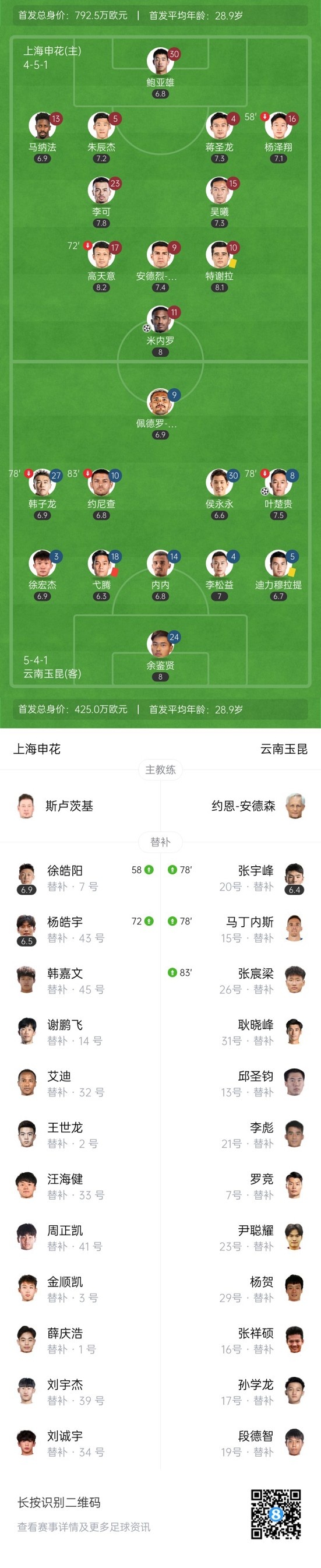 下半场补时6分钟,申花3-1云南玉昆。