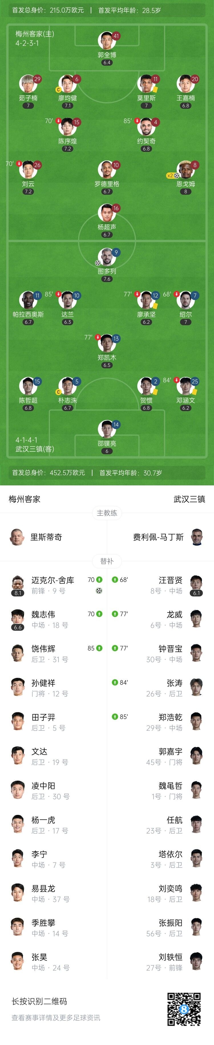 伤停补时8分钟。全场比赛结束,梅州客家3-1武汉三镇。
