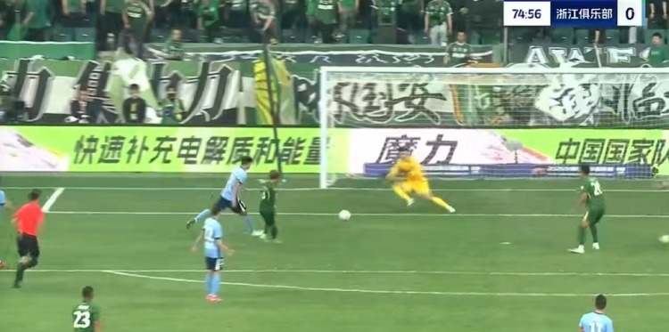 第75分钟,国安左侧肋部送出斜塞,浙江防守漏球,古加跟进连续的假动作晃过防守直面门将打门,赵博再次飞身扑出↓
