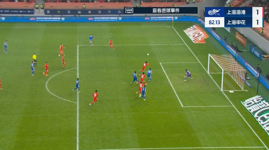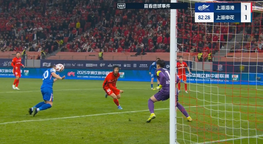第82分钟,陈晋一左路传中,于汉超禁区中路前插头球破门,马宁经VAR确认后进球有效,上海申花1-1上海海港。↓