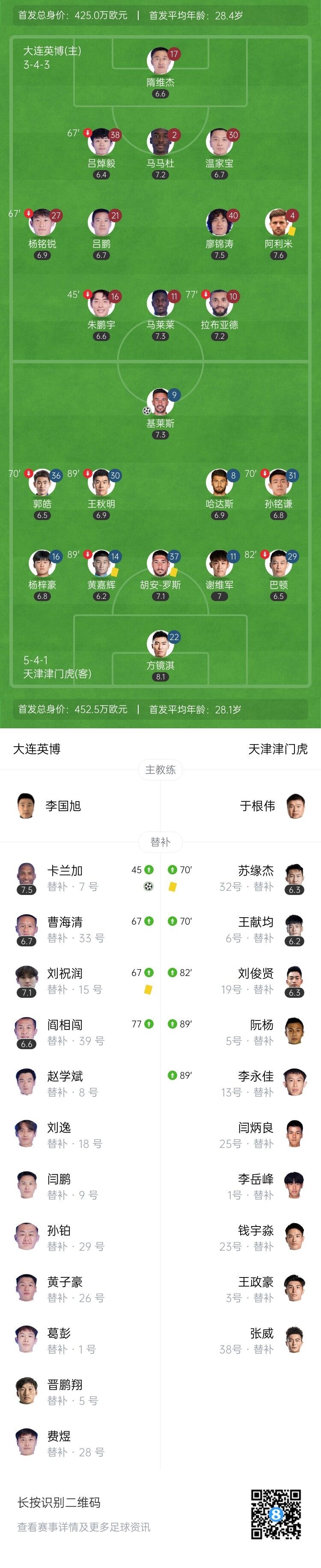 下半场比赛伤停补时6分钟。全场比赛结束,大连英博1-1天津津门虎。