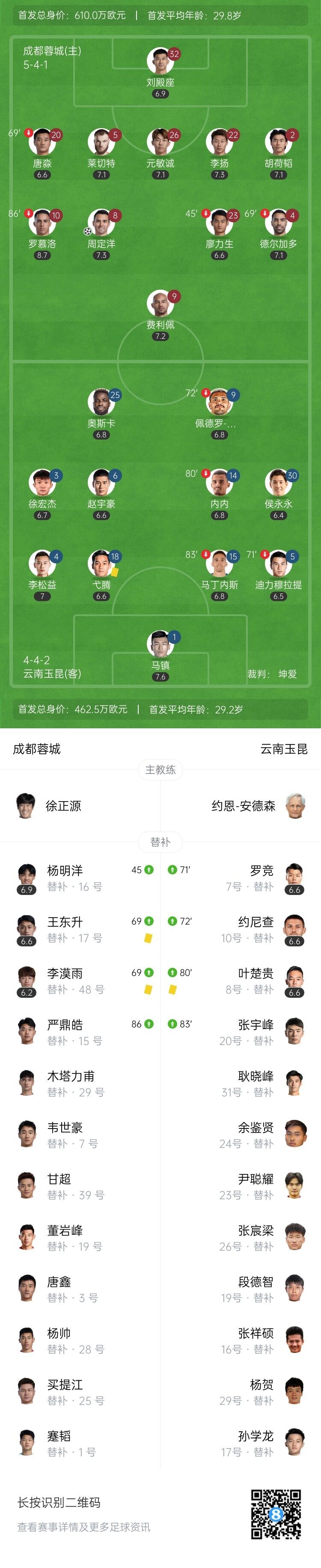 伤停补时5分钟。全场比赛结束,成都蓉城1-1云南玉昆。
