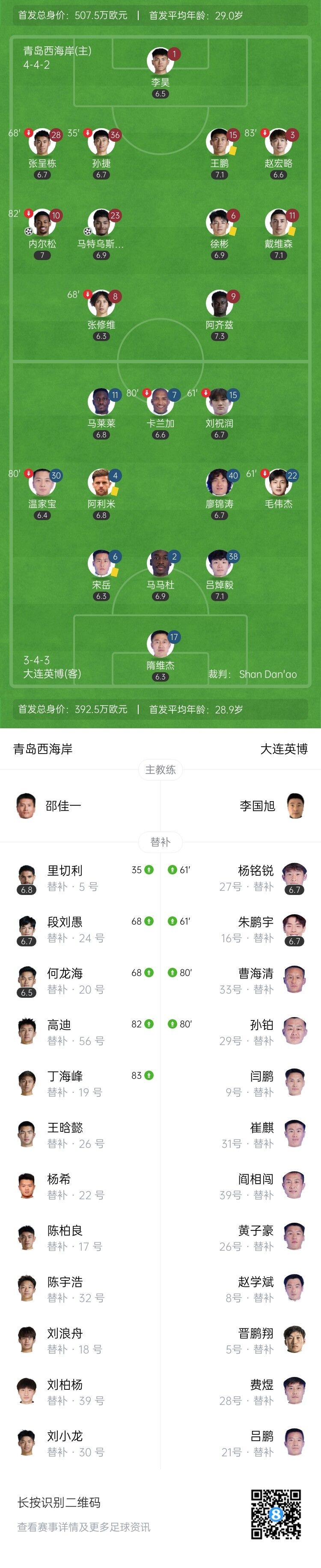 第34分钟,青岛西海岸队长孙捷受伤无法坚持被里切利换下。↓