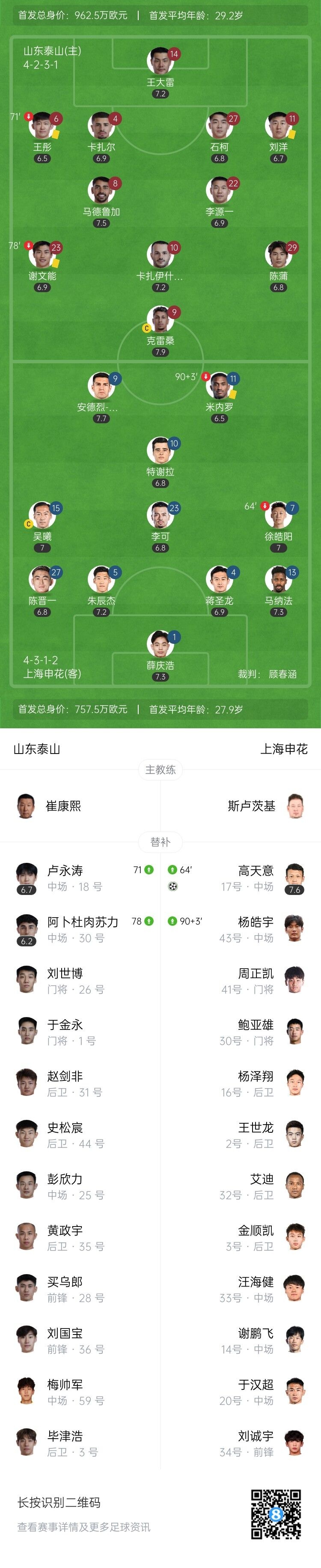 伤停补时5分钟。全场比赛结束,山东泰山0-1上海申花。