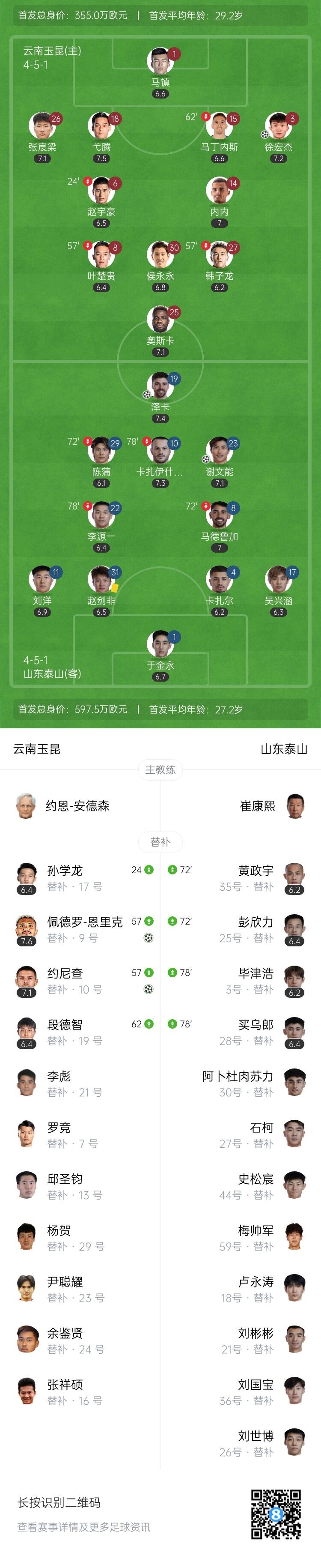 伤停补时5分钟。全场比赛结束,云南玉昆3-2山东泰山。