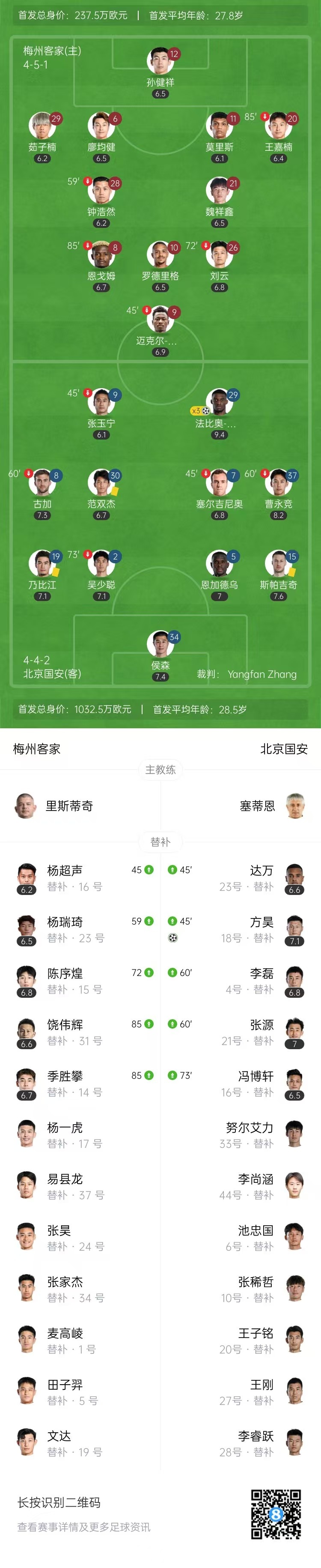 第20分钟,古加右路突破后倒三角传中,法比奥门店轻松包抄破门,北京国安1-0梅州客家。↓