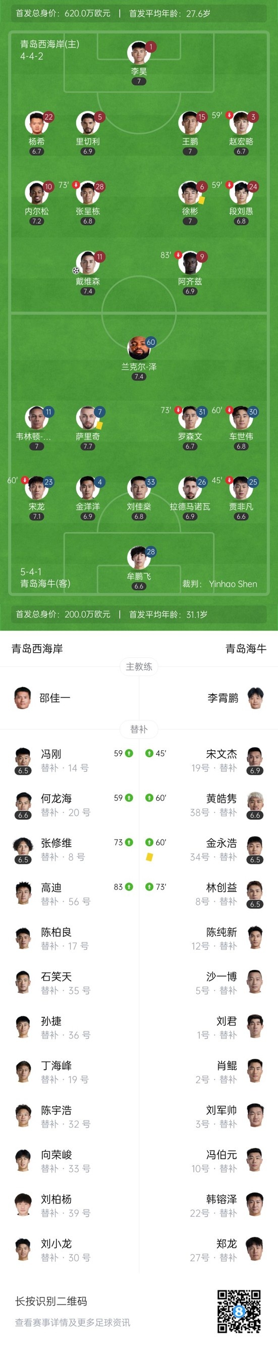 上半场补时3分钟,青岛西海岸1-0青岛海牛。
