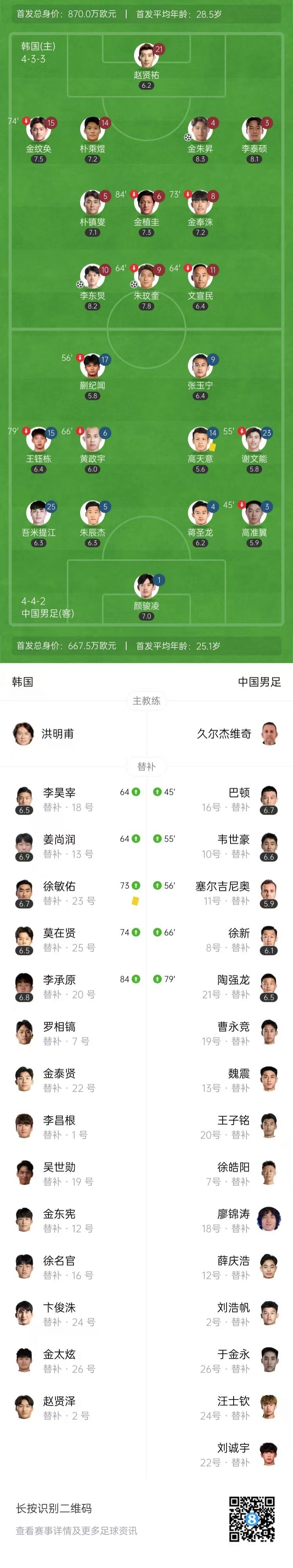 第56分钟,韩国右侧角球机会,前点头球攻门被颜骏凌挡出,金朱昇后点补射得手,韩国男足3-0中国男足。↓