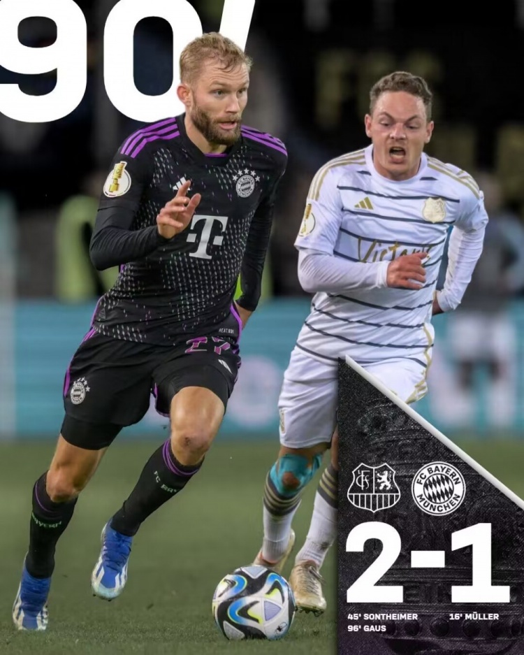 11月2日讯 北京时间11月2日凌晨3点45分,2023-24赛季德国杯第2轮展开角逐,拜仁慕尼黑客场挑战德丙队萨尔布吕肯。上半场穆勒远射首开纪录,德里赫特伤退,拜仁后场被断致丢球,下半场高斯补时绝杀。最终拜仁客场1-2遭萨尔布吕肯逆转绝杀,拜仁止步德国杯第2轮,各赛事13场不败遭终结。