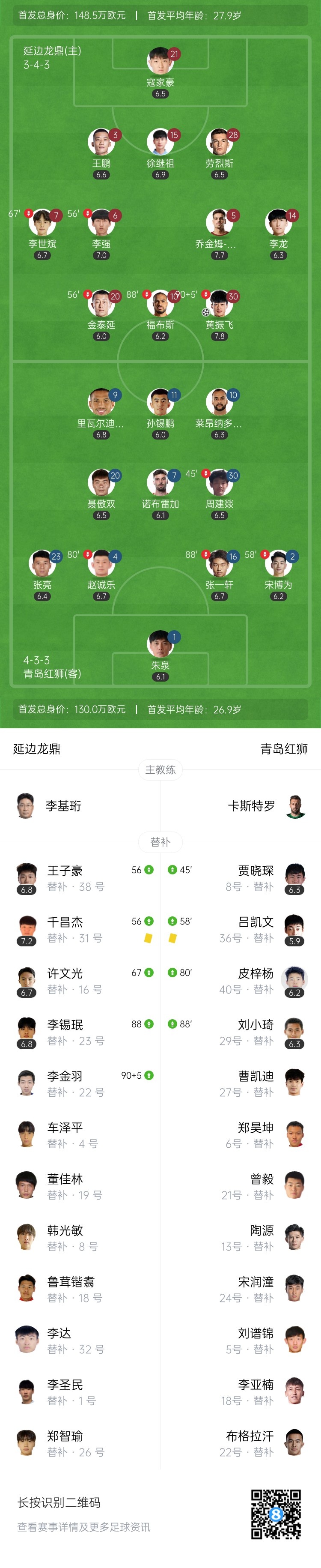 第90+5分钟,本场的进球功臣黄振飞被换下场↓