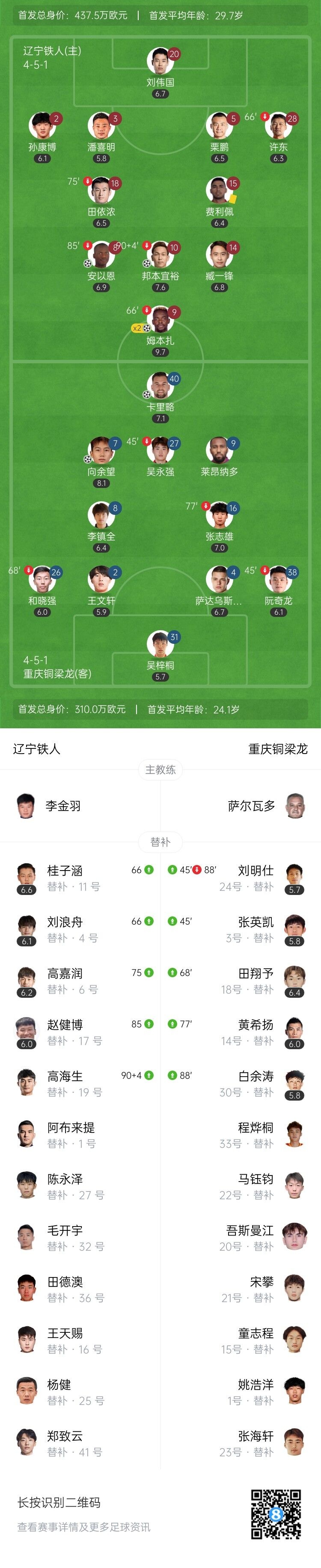 伤停补时9分钟。全场比赛结束,辽宁铁人4-2重庆铜梁龙。