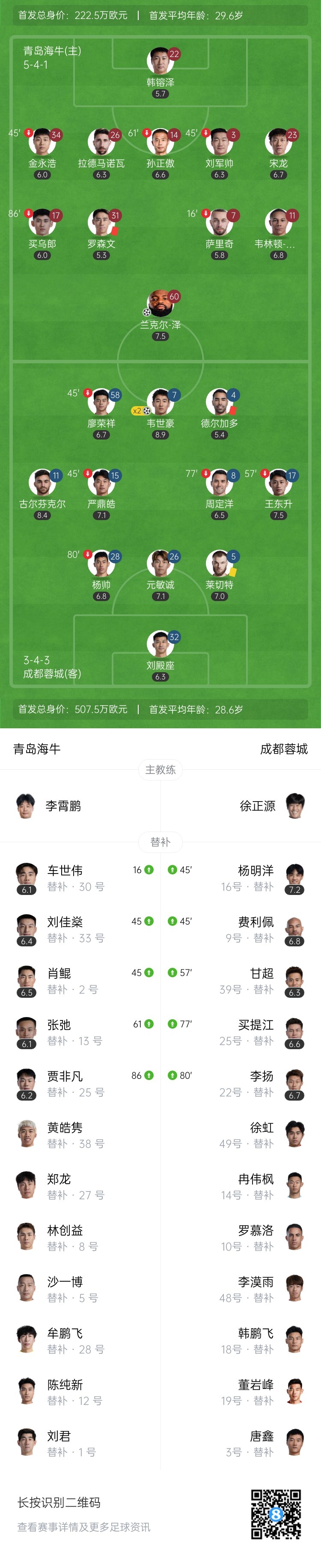 第15分钟,青岛海牛队长萨里奇因伤无法坚持比赛,被换下场↓