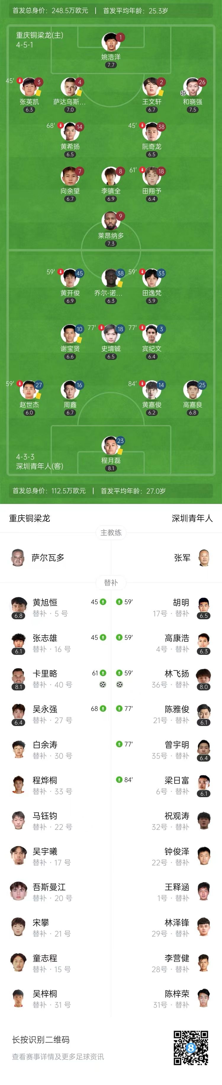 第75分钟,深圳青年人左路反击,高康浩禁区左侧倒地横传,林飞扬跟进进球打入网窝,1-1!↓