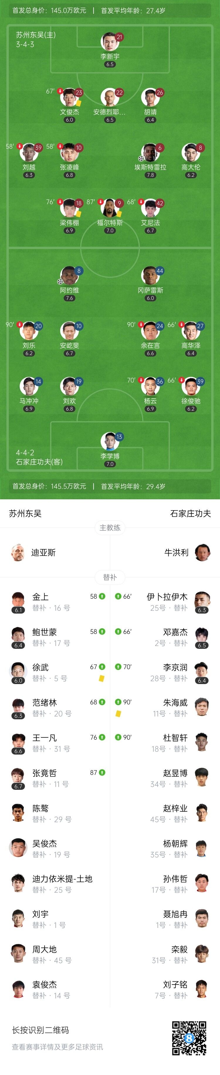 伤停补时8分钟。全场比赛结束,苏州东吴1-1石家庄功夫。