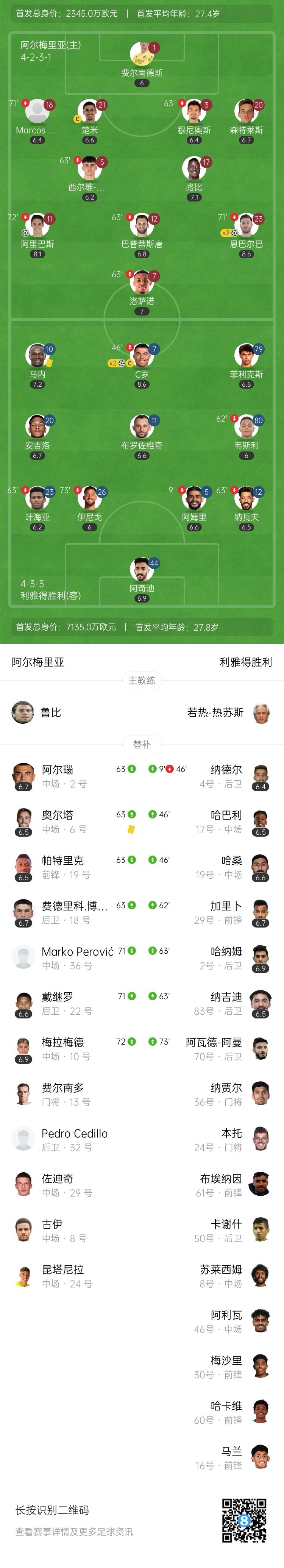 全场比赛结束,利雅得胜利2-3不敌阿尔梅里亚。