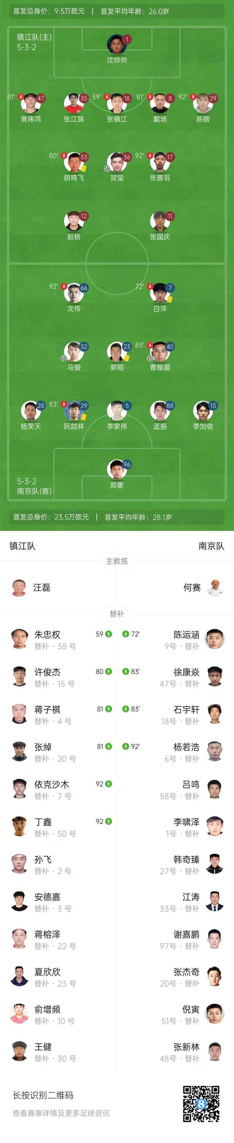 第20分钟,镇江打出反击,南京混乱中未能将球解围,陈锴小禁区右侧倒三角传中,贺玺抢点扳平比分,镇江1-1南京。↓