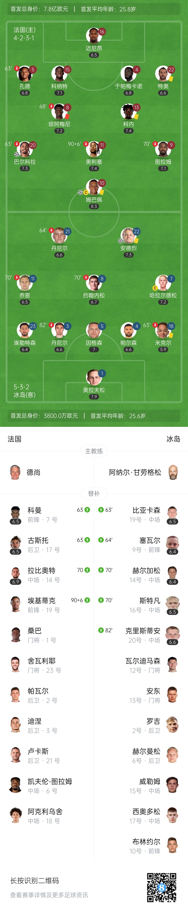 9月10日讯 世预赛欧洲区小组赛D组第二轮,法国坐镇主场王子公园球场迎战冰岛。上半场,奥利塞致命失误乌龙助攻,古德约翰森破门,姆巴佩点射。易边再战,姆巴佩助攻巴尔科拉破门,琼阿梅尼直红,古德约翰森绝平被吹。最终法国2-1冰岛。积分榜方面,法国两连胜领跑,冰岛2轮3分。