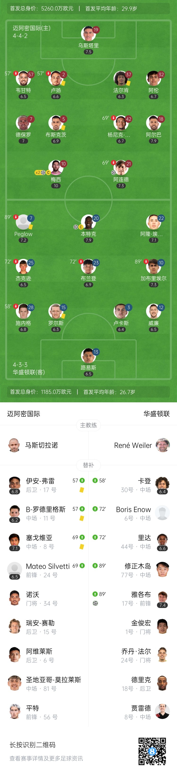 第52分钟,华盛顿联右路传中,本特克禁区内扛人俯身冲顶破门!华盛顿联1-1扳平迈阿密国际↓