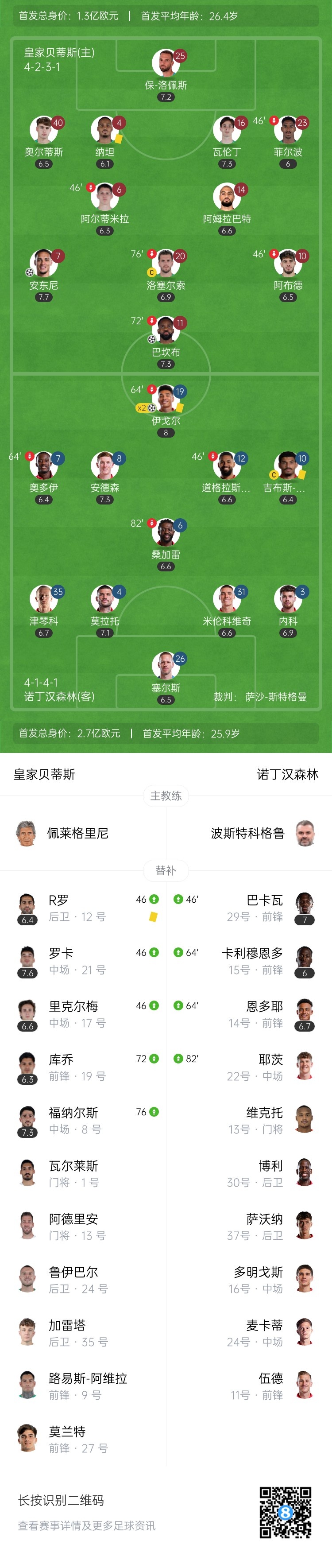第85分钟,罗卡传中到后点,安东尼包抄推射绝平!本场传射建功!贝蒂斯2-2扳平诺丁汉森林↓