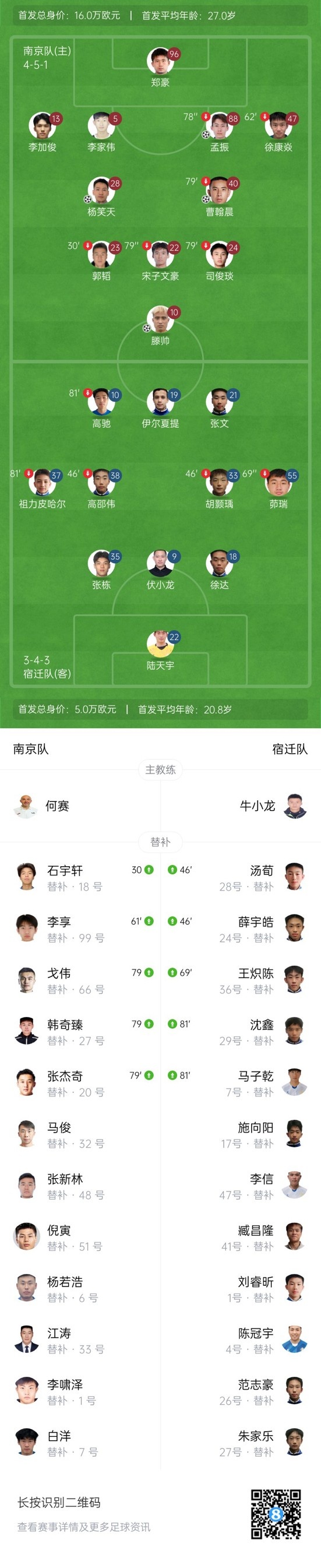 9月27日讯 北京时间9月27日19:35,江苏联第13轮南京迎战宿迁的比赛在南京奥体中心进行,上半场滕帅抽射破门首开记录,孟振外脚背破门扩大比分,下半场杨笑天补射建功,曹翰晨远射破门,最终南京4-0宿迁成功晋级淘汰赛,宿迁排名第9无缘晋级。