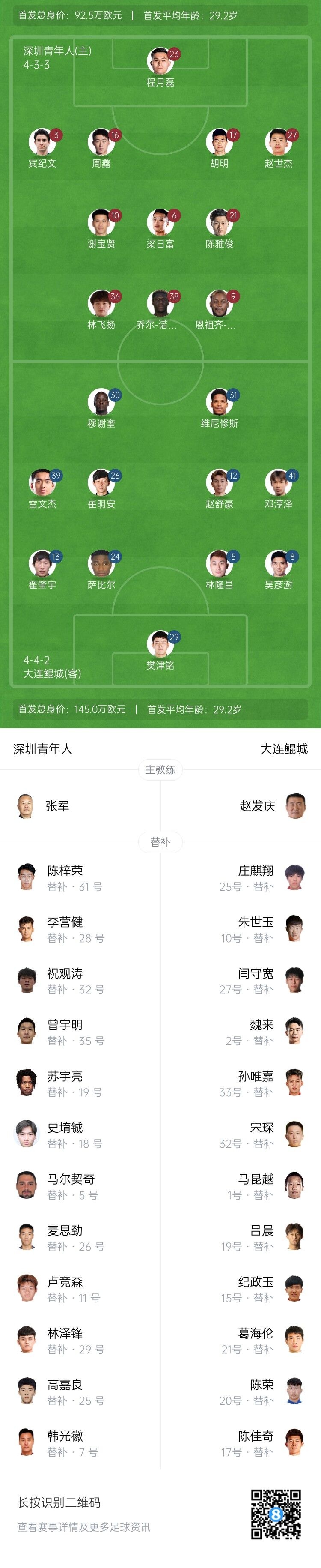 9月27日讯 北京时间9月27日晚上19:30,中甲第24轮,深圳青年人坐镇深圳宝安体育中心体育场迎战大连鲲城。上半场,吴彦澍、穆谢奎先后破门。下半场,恩祖齐-马塔扳回一球,穆谢奎梅开二度。全场结束,深圳青年人1-3大连鲲城。本场过后,深圳青年人积23分排名第13,仅高出降级区2分;大连鲲城积38分升至第五。