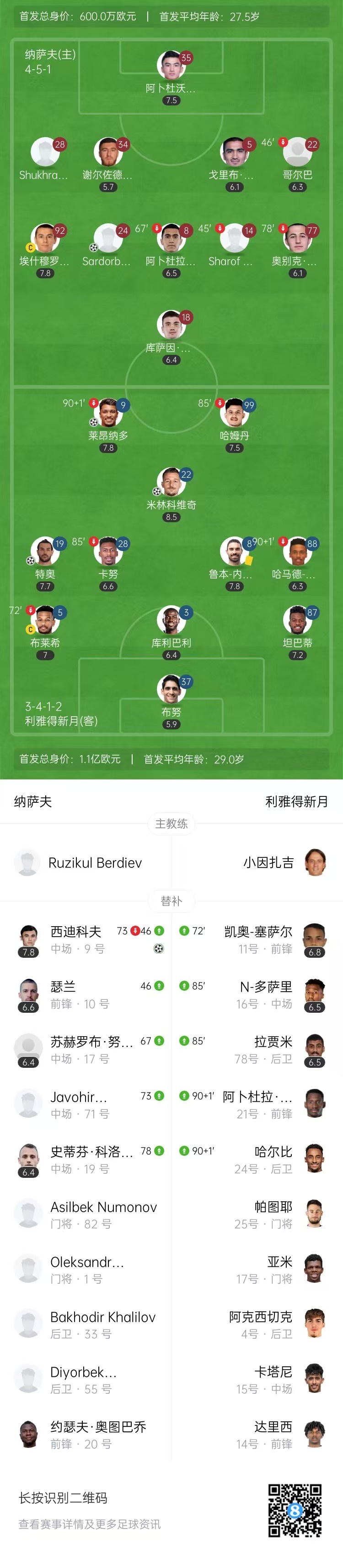 第27分钟,萨尔多尔别克前场轰出一脚世界波扳平比分,纳萨夫1-1利雅得新月。↓