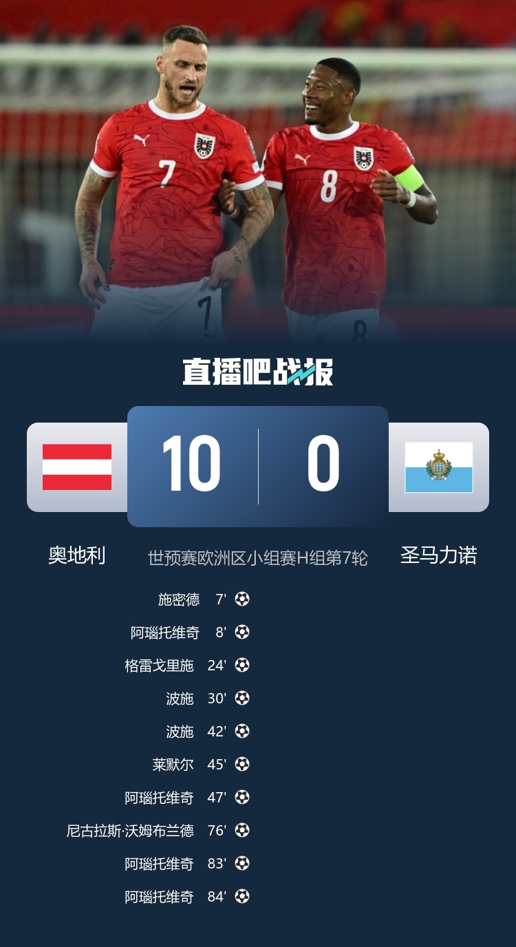 残暴!奥地利世预赛10-0狂胜圣马力诺,阿瑙大四喜、莱默尔破门