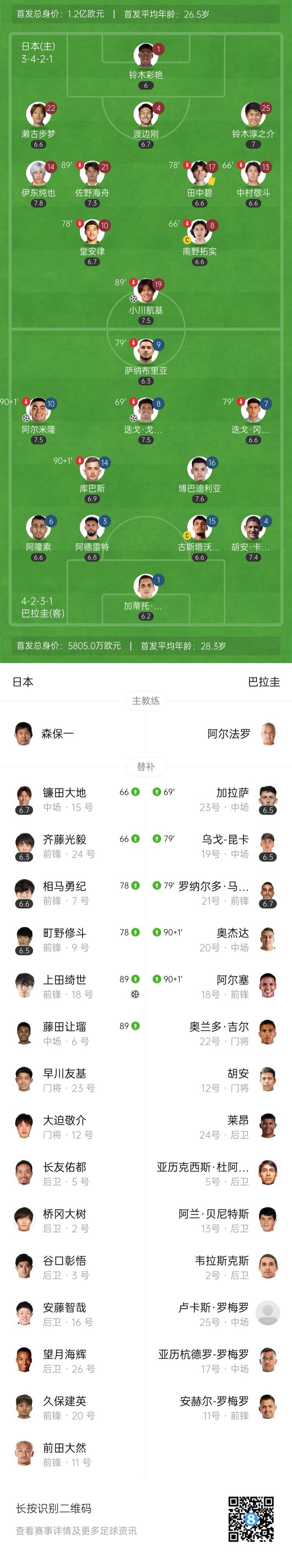 第26分钟,日本队扳平比分,佐野海舟助攻,小川航基远射力量极大,巴拉圭门将扑了一下但无法阻止皮球飞入球网,日本队1-1巴拉圭队。↓