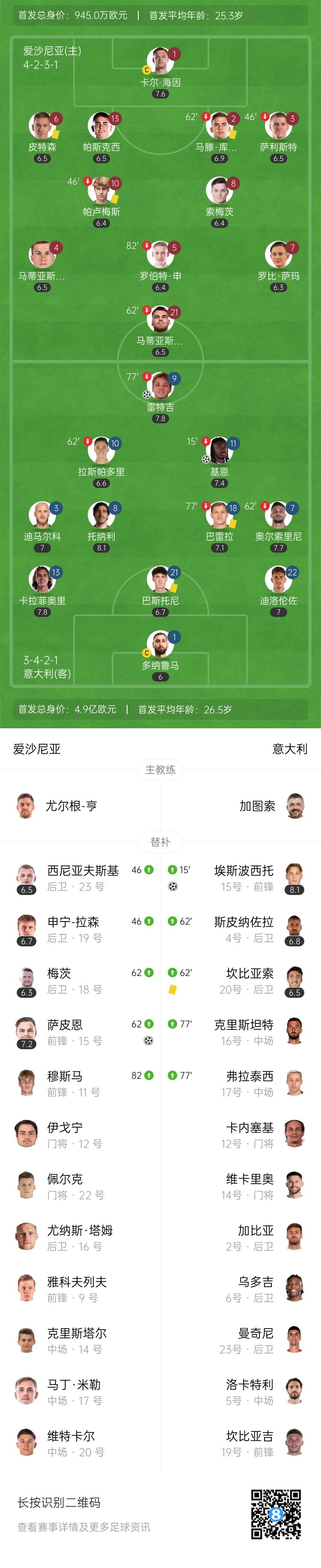 下半场伤停补时3分钟,全场比赛结束,最终意大利3-1爱沙尼亚。