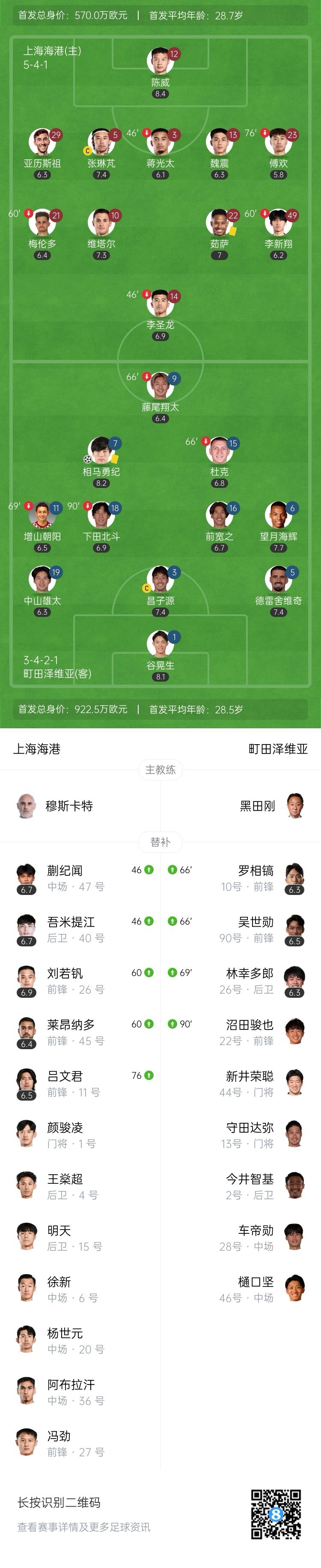 全场比赛结束,海港0-2不敌町田泽维亚。