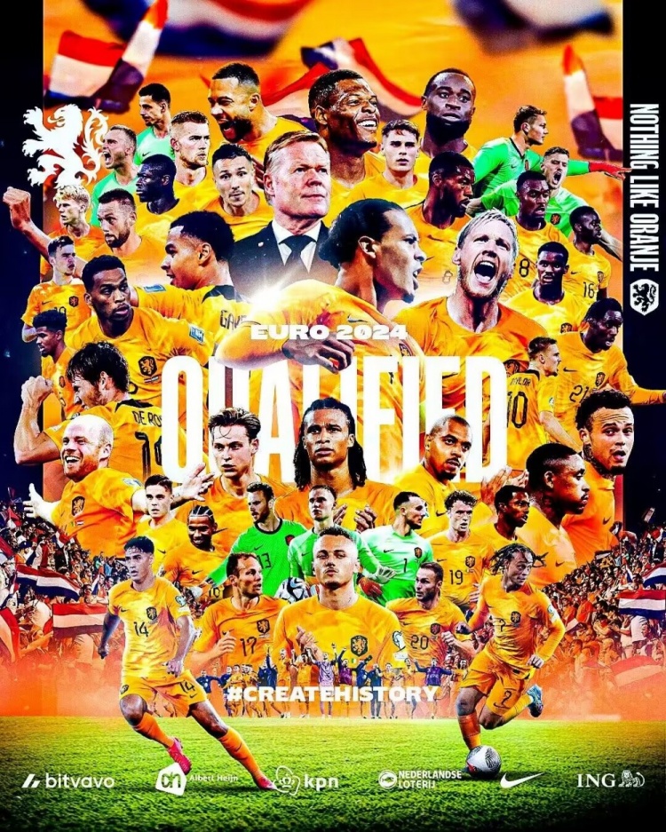 比赛结束,荷兰球迷和将帅庆祝晋级欧洲杯正赛。↓
