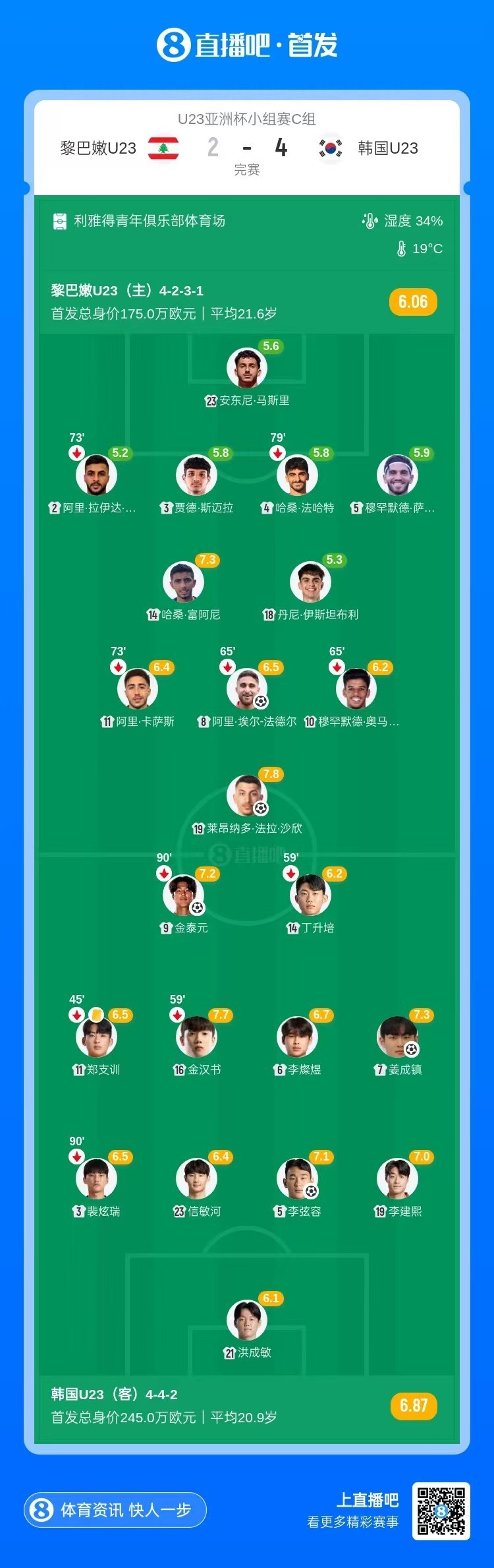 2战1胜1平!韩国U23两度落后4-2逆转黎巴嫩 末轮对阵乌兹别克U23