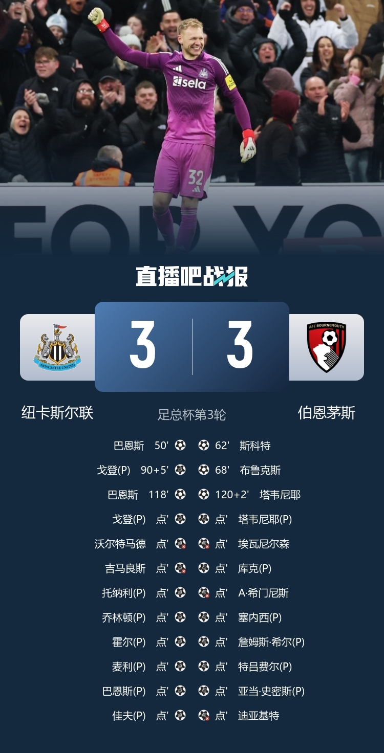 刺激!纽卡3-3点球7-6淘汰伯恩茅斯 拉姆斯代尔3扑点两队各献绝平