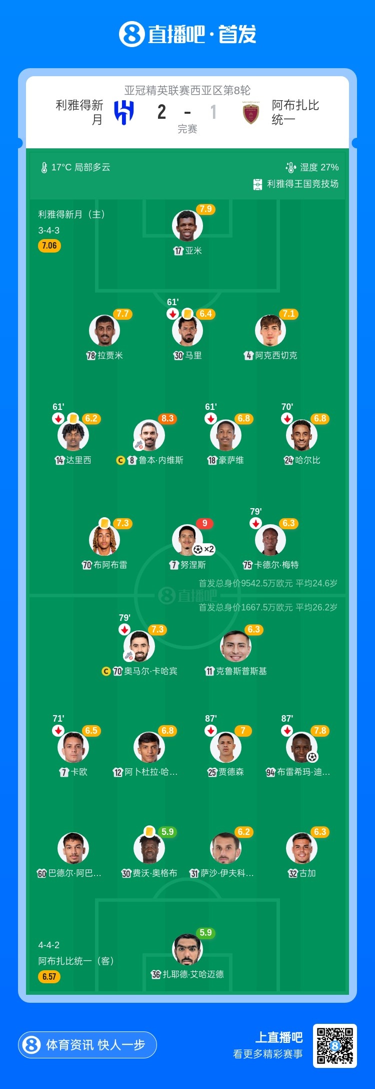2月17日讯 北京时间2:15,亚冠精英联赛西亚区第8轮利雅得新月vs阿布扎比统一,本场比赛由马宁执法。上半场,努涅斯头球破门,随后又错失单刀良机;布雷希玛·迪亚拉扳平比分!下半场,努涅斯包抄再下一城!最终,利雅得新月2-1击败阿布扎比统一,亚冠7胜1平头名晋级,各项赛事32场不败。