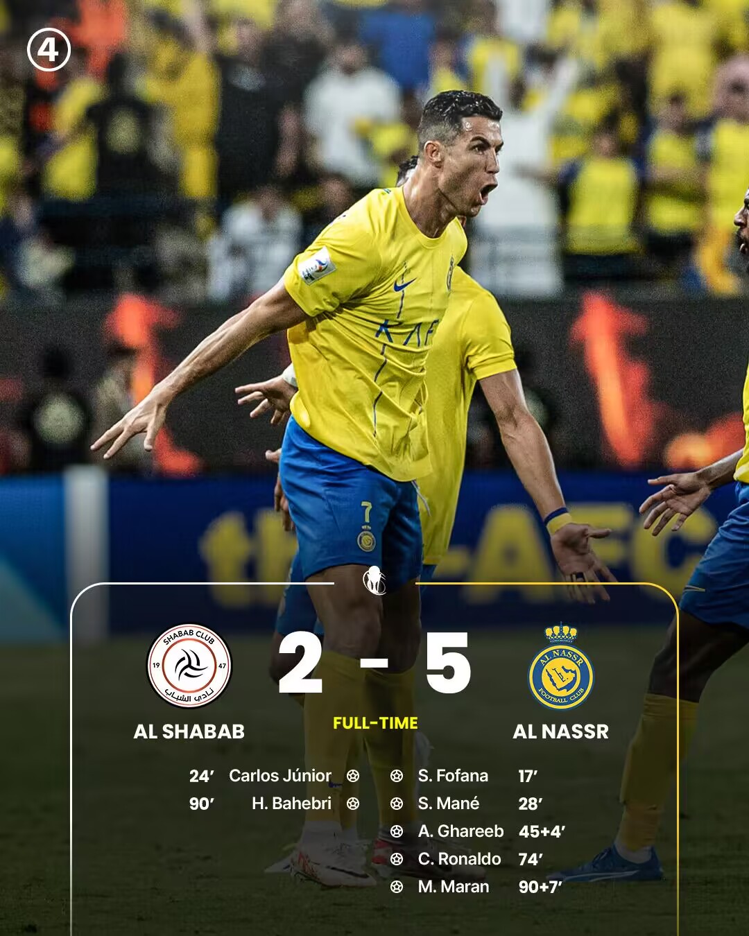 沙王冠-C罗年度50球马内传射建功 利雅得胜利5-2青年人晋级4强