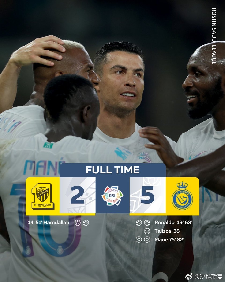 第76分钟,C罗中场直塞,塔利斯卡单刀球无私横传,马内推射空门得分,吉达联合2-4利雅得胜利!↓