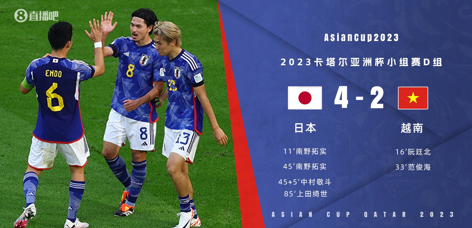 1月14日讯 北京时间今晚19:30,亚洲杯D组第1轮,日本对阵越南。上半场比赛,南野拓实推射打破僵局,阮廷北头球回头望月扳平比分,铃木彩艳扑救失误范俊海补射反超比分,南野拓实推远角完成梅开二度,上半场最后时刻中村敬斗兜射死角得分;下半场比赛,久保建英助攻上田绮世抽射锁定胜局。全场比赛结束,日本4-2战胜越南取得开门红。