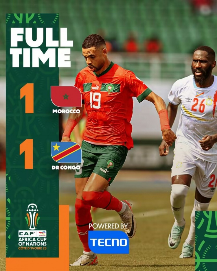 全场比赛结束,摩洛哥1-1民主刚果。