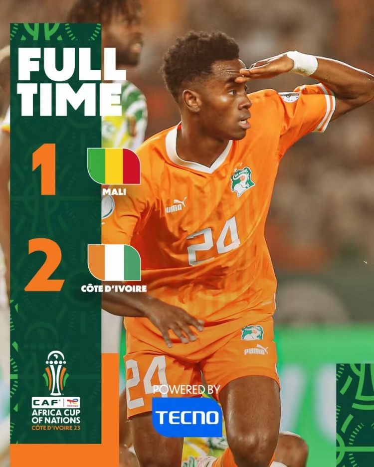 全场比赛结束,双方鏖战120分钟,科特迪瓦2-1击败马里。